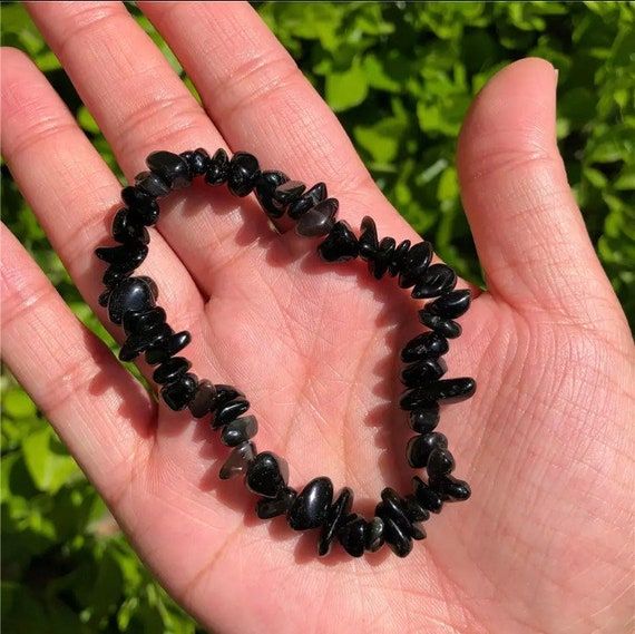 A bracelet made of small, irregularly shaped black stone beads, strung together to fit around a wrist. The bracelet is displayed in an open hand with a natural background of green leaves, highlighting its earthy and minimalist aesthetic. The black stones give the bracelet a sleek and understated look.